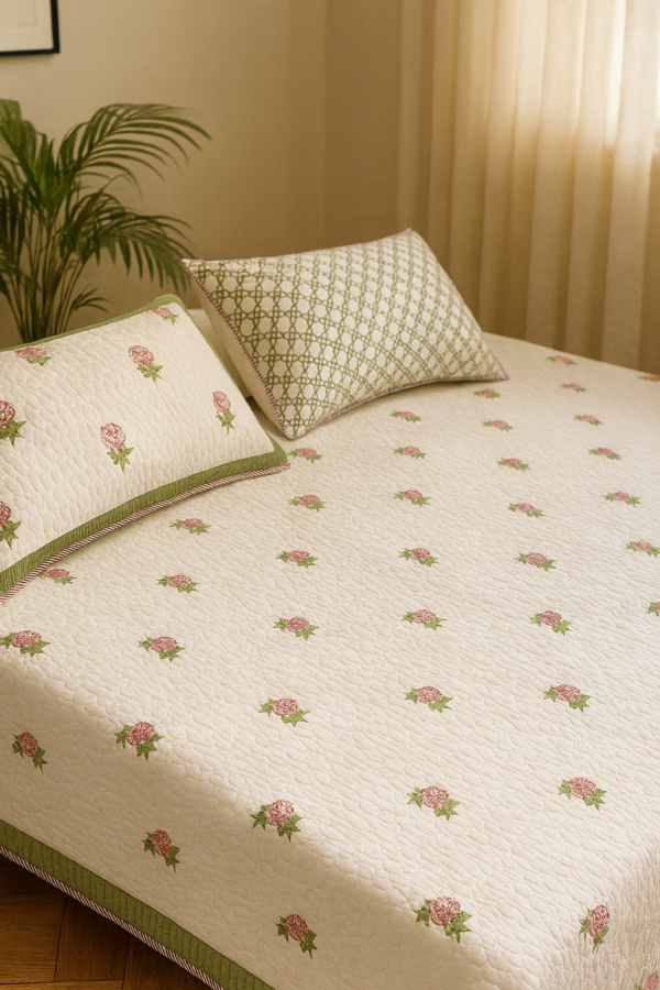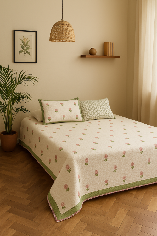 Elevate your bedroom with our exquisite quilted double bed cover set, complete with two pillow covers! Crafted from premium materials, it adds a touch of elegance to your sanctuary. With its reversible design and machine washable fabric, beauty meets practicality for a seamless bedtime experience.