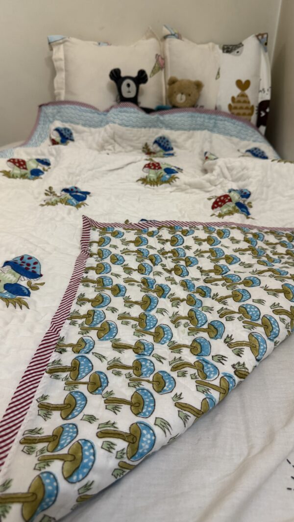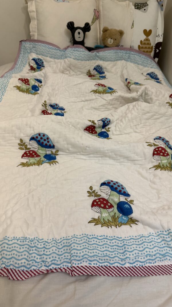 Wrap your little one in snuggly warmth with our playful mulmul cotton reversible kids razai! Soft, breathable fabric ensures cozy nights, while reversible designs add a dash of fun. Let their imagination soar as they drift into dreamland, cuddled in comfort and style.