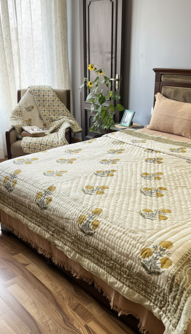 Handcrafted mul mul quilt with block prints, filled with soft cotton for warmth and comfort.